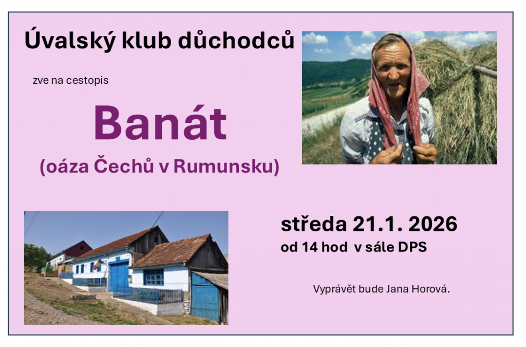 Pozvánka na cestopis Úvalského klubu důchodců – Banát (Rumunsko). Více v přiložené pozvánce.