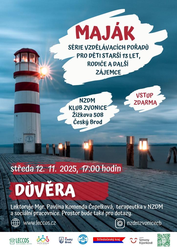 Záměrem setkání je přiblížit dětem a mladým lidem význam důvěry v mezilidských vztazích a ukázat, jak se důvěra získává, udržuje i ztrácí. Maják proběhne v NZDM Klub Zvonice, Žižkova 508, Český Brod ve středu 12. 11. 2025 od 17:00 hodin. Lektoruje Mgr. Pavlína Komenda Čepelková, terapeutka v NZDM Klubu Zvonice a sociální pracovnice. Vstup zdarma.