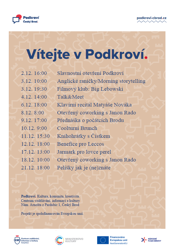Otevřené setkání pro veřejnost, kde můžete nahlédnout do nově zpřístupněného prostoru kulturního centra a podělit se o své dotazy a podněty.