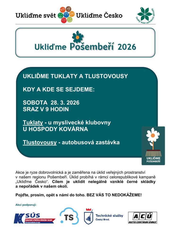 Přijďte se zapojit do akce Ukliďme Pošembeří 2026, která se zaměřuje na úklid veřejných prostranství v našem regionu. Tato dobrovolnická akce probíhá v rámci celorepublikové kampaně „Ukliďme Česko“ a jejím cílem je uklidit nelegální skládky a nepořádek v okolí.