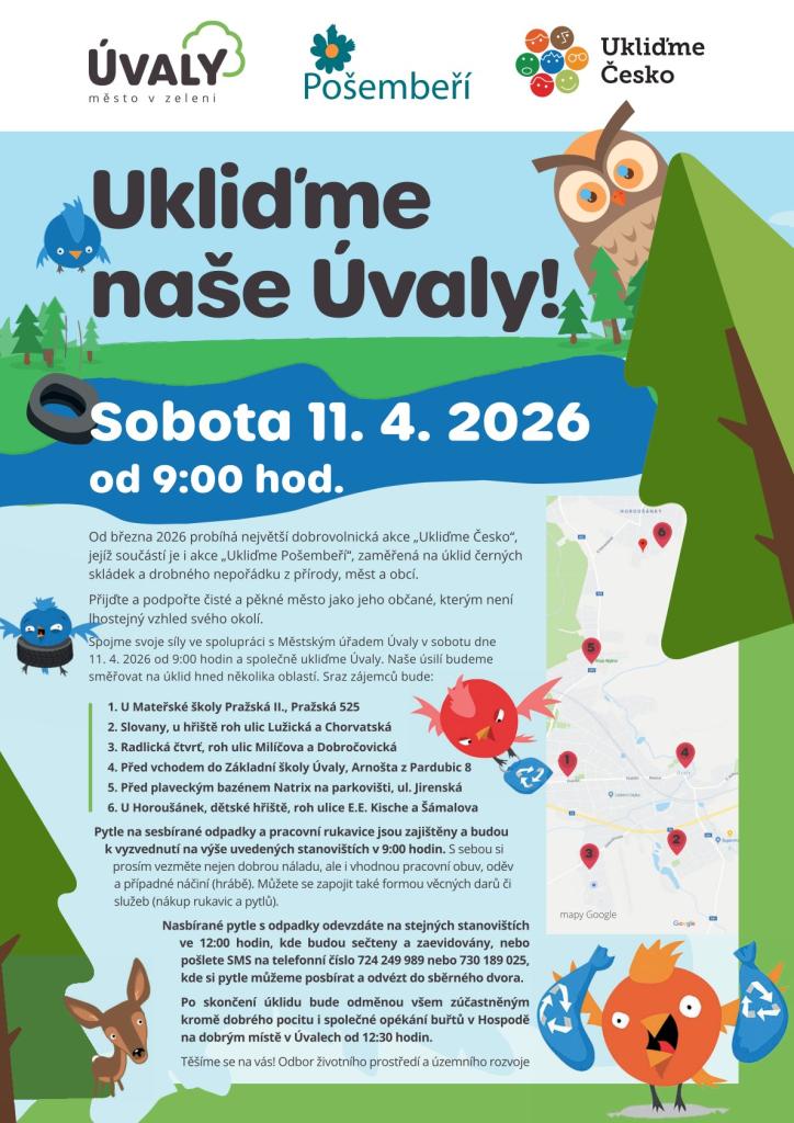 Přijďte podpořit čisté a pěkné město Úvaly. V sobotu 11. dubna 2026 od 9:00 hodin se sejdeme na různých místech v Úvalech, abychom společně uklidili naše okolí. Sraz bude u Mateřské školy Pražská II., na Slovanech u hřiště, v Radlické čtvrti, před Základní školou Úvaly, před plaveckým bazénem Natrix