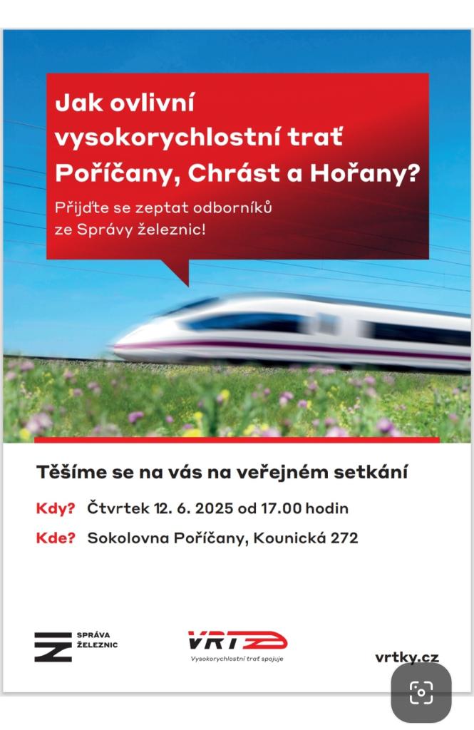 Ve čtvrtek, 12. 6. 2025 od 17.00 v poříčanské sokolovně zástupci Stavební správy vysokorychlostních tratí (VRT) pro vás připraví prezentaci, ve které podrobně představí podobu trasy vysokorychlostní železnice, průběh přípravy a její dopady na trase Praha–Běchovice – Poříčany a napojení do Nymburka. Specialisté z řad Správy železnic, budou na setkání připraveni zodpovědět veškeré vaše dotazy.